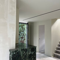 Die Kernsanierung des Siedlungshauses der 30er Jahre basiert auf der Optimierung des Grundrisses. Die Umorientierung des Treppenhauses hin zur Straße, um die Aufenthalts- und Schlafräume dem ruhigen Garten hinzuwenden, erforderte die Öffnung aller Decken. Zur Raumgewinnung wurde das Dach zur Straße hin durch zwei Gauben ergänzt. Das Interior wurde aufwendig mit qualitativ hochwertigsten Materialien ausgestattet. Herz und Kernstück bildet der Kamin sowie die sich darum angeordnenten Einbauschränge und Nischen, welche den Raum zonieren und gleichzeitig Stauraum schaffen.